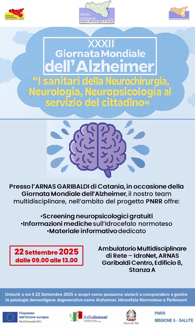 In occasione della XXXII Giornata Mondiale dell’Alzheimer, l’Ambulatorio Multidisciplinare di Rete per l’Idrocefalo Normoteso – IDRONET, attivo presso l’ARNAS Garibaldi di Catania, promuove un’iniziativa di prevenzione aperta alla cittadinanza per offrire: screening neuropsicologico gratuito valutazione multidisciplinare clinica brochure informative sulle patologie dementigene Durante l’incontro, i pazienti saranno valutati da un’équipe multidisciplinare, che effettuerà una diagnosi collegiale finalizzata all’individuazione precoce di eventuali segnali di patologie dementigene, tra cui l’Idrocefalo Normoteso. L’attività rientra nell’ambito del Progetto PNRR IDRONET, che coinvolge specialisti afferenti a diverse strutture sanitarie del territorio. Tra i professionisti impegnati nella giornata: Dott.ssa Francesca Graziano e Dott. Gianluca Scalia – UOC di Neurochirurgia, ARNAS Garibaldi (Direttore: Prof. Giovanni Nicoletti); Dott.ssa Mariangela Panebianco – Dirigente Neurologa, UOC di Neurologia, ARNAS Garibaldi (Direttore: Dott. Luigi Sicurella); Dott. Pietro Trombatore – Dirigente Neuroradiologo, UOC di Radiologia e Diagnostica per Immagini; Dott. Gianluca Galvano – Direttore, UOC di Radiologia e Diagnostica per Immagini; Dott.ssa Grazia Razza – Dirigente Psicologa, Dipartimento di Salute Mentale, ASP 3 di Catania; Dott. Nicola Alberio – Dirigente Neurochirurgo, UOC di Neurochirurgia, AO Cannizzaro (Direttore: Dott. Salvatore Cicero); Dott.ssa Lisa Passarello e Dott.ssa Roberta Finocchiaro – Neuropsicologhe del progetto PNRR. Nel corso dell’evento saranno inoltre distribuite brochure informative gratuite, con l’obiettivo di sensibilizzare i cittadini e fornire strumenti utili alla comprensione delle patologie neurodegenerative e delle relative opzioni terapeutiche. 22 Settembre 2025 h. 9:00- 13:00 Ambulatorio multidisciplinare di rete dell'Idrocefalo Normoteso- IDRONET ARNAS Garibaldi Catania Stanza A, Edificio 8 L'evento è gratuito e aperto al pubblico, senza necessità di prenotazione.